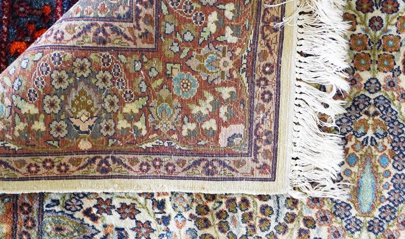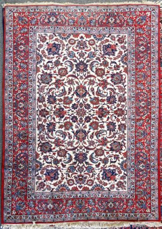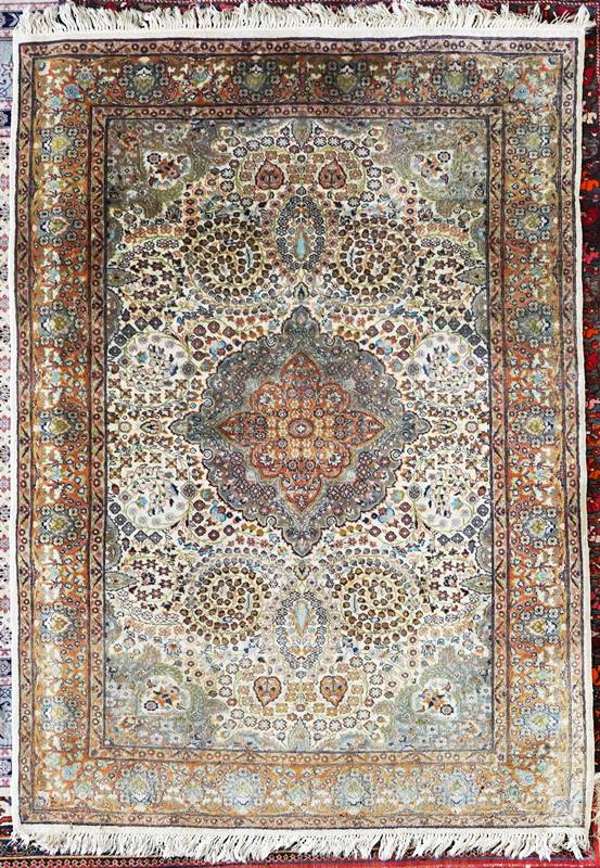Wolle. Zentrales Medaillon auf weißgrundigem Innenfeld mit Eckzwickeln. Umgeben von drei Bordüren. Ca. 6 x 6 Knoten/qcm, Größe ca. 215 x 140 cm.