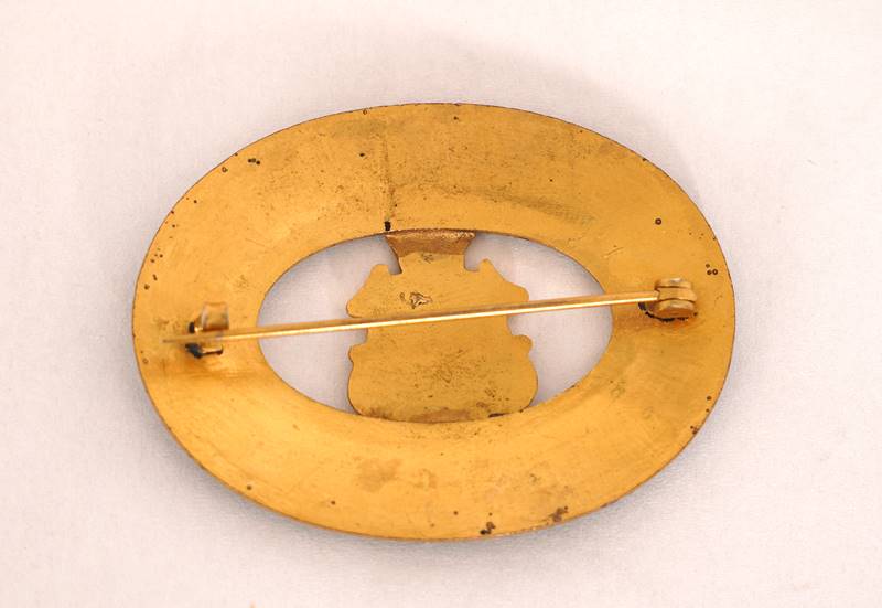 Kanada um 1900. Metall, emailliert. Brosche in Form des stilisierten Wappens von Kanada von 1873-1907 umgeben von einem ovalen Ring. Größe ca. 6,5 x 5 cm. Diese Art von Broschen waren um die Jahrhundertwende ein beliebtes Andenken an ein bereistes Land.