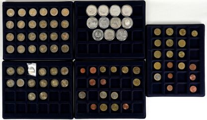 Münzkoffer Inhalt auf fünf Ebenen mit elf 10-Euro Gedenkmünzen in Kapsel (außen teils verklebt), zwei Platten mit diversen Euro und Eurocent-Münzen, nominal ca. 10,44 € und zwei Platten mit diversen 2-Euro Münzen, nominal ca. 76.-€. Gesamt also ca. 196,44. Bitte selbst besichtigen.