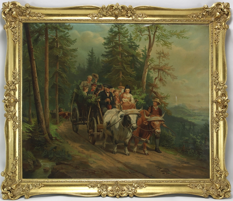Schöner Rahmen Deutsch 19. Jh. Opulenter goldfarbener Stuckrahmen. Darin ein Druck eines Gemäldes von Johann Hermann Kretzschmer (1811-1890), auf einer Leinwand dubliert. Größe des Rahmens ca. 65 x 75 cm.