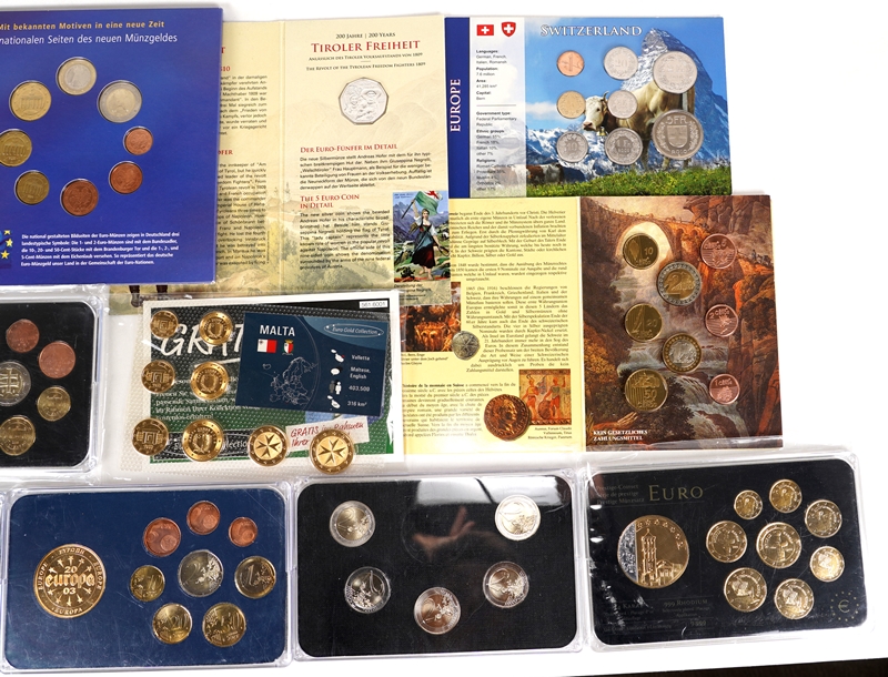 Zehn Münzsätze Jeweils noch im Originalblister. Mehrere Euromünzensätze, Europrobe Geldgeschichte der Schweiz, Schweizer Münzensatz, D-Mark und Eurosatz und ein Eurofünfer Tiroler Freiheit.