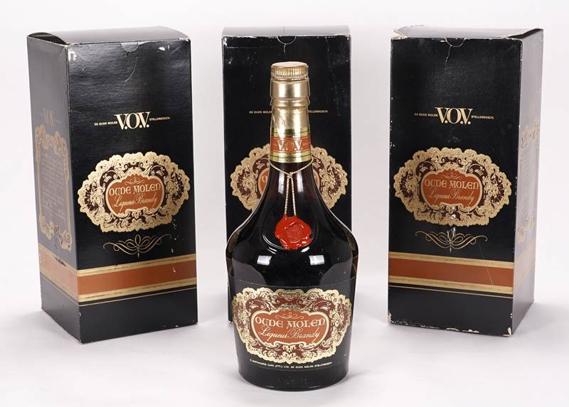 Vier Flaschen Liqueur-Brandy Oude Molen V.O.V. Bertram Stellenbosch Südafrika 1980-er Jahre. Unterschiedliche Füllstände, ca. Mitte Schulter bis Anfang Hals. Drei in OVP.