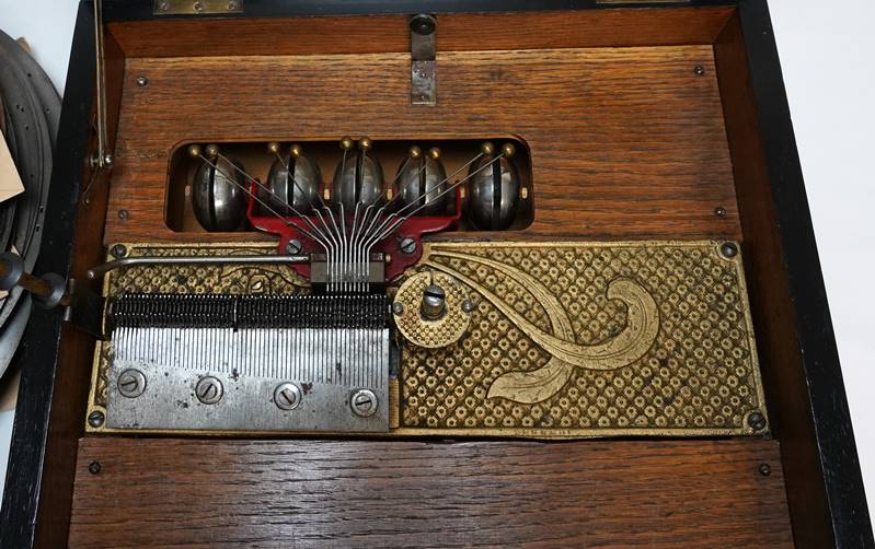 Leipzig um 1900. Kalliope Musikwerke AG. Rechteckiges Holzgehäuse mit Bezeichnung auf dem Deckel und romantisierender Küstendarstellung im Deckel. Anbei Kurbel und ca. 50 Lochplatten mit verschiedenen Liedern. Größe ca. 40 x 38 cm, Höhe ca. 20 cm. Gesamtgewicht ca. 23 kg. Läuft an, Platten in unterschiedlichen Zuständen.