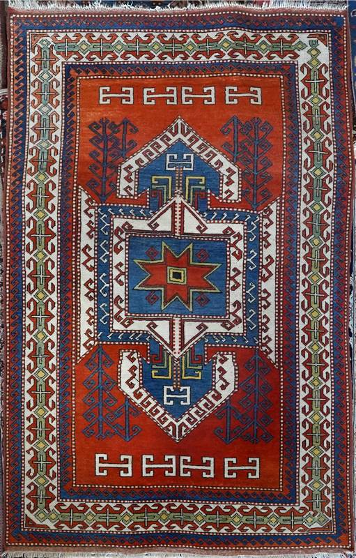Sewan Kasak 20. Jh. Wolle. Weißgrundige Dreifachbordüre um rotes Innenfeld mit zentralem Medaillon und geometrischen Mustern. Größe ca. 230 x 135 cm, ca. 3 x 3 Knoten/qcm, Gewicht ca. 7,8 kg.