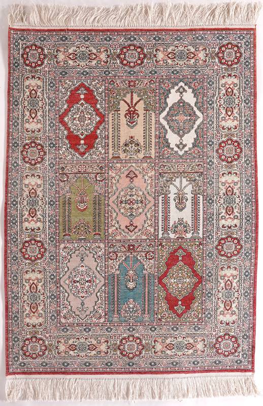 Seidenteppich 20. Jh. Kleiner Felderteppich mit fünf Bordüren und neun Feldern im Innenfeld. Größe ca. 131 x 63 cm, ca. 9 x 9 Knoten/qcm. Minimale Beschädigungen.