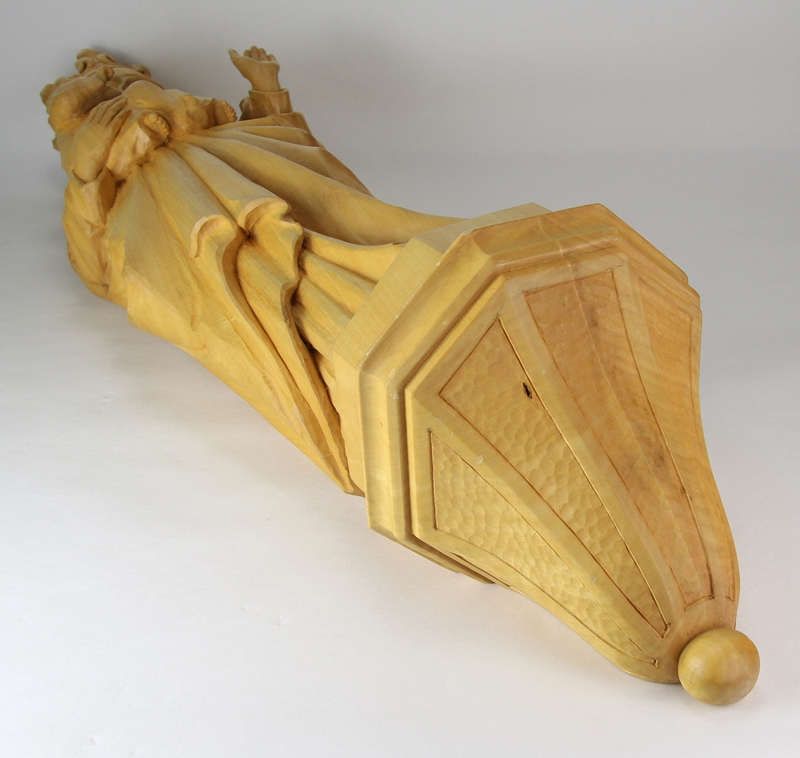 Franz Weber 1984. Holz geschnitzt. Mit dem passenden Wandsockel. Größe der Figur ca. 18 x 13 cm, Höhe ca. 76 cm, Gewicht ca. 4,3 Kilogramm. Schöner Zustand.