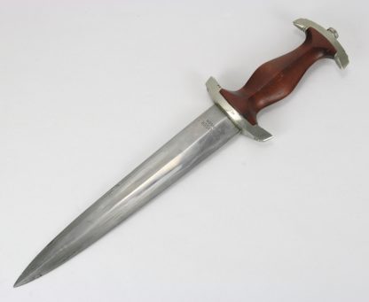 SA Dolch Deutsch, 20.Jh. Hersteller C. F. Kayser Solingen. SA Dienstdolch mit braunem Holzgriff mit Emblemen in brauner Scheide mit Tragering mit Lederhänger. Klingeninschrift "Alles für Deutschland", Gebietszeichen auf der Parierstange. Klingenlänge ca. 22,5 cm, Gesamtlänge ca. 37 cm. Gewicht ca. 0,46 kg. Guter Zustand.