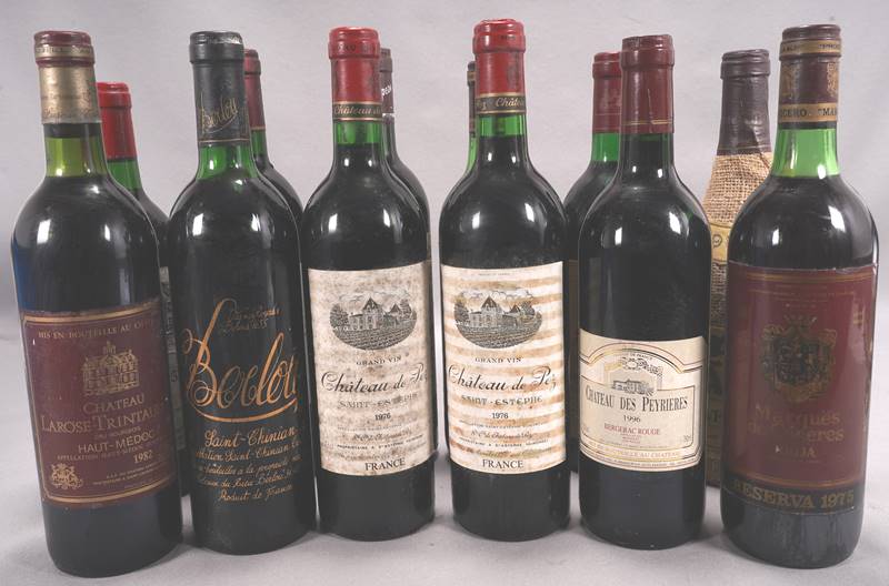 Zwölf Flaschen 0,75l, meist Frankreich, teils Spanien und Portugal. 2 x Chateau de Pez Saint-Estephe 1976, 1 x Chateau Larose-Trintaudon Haut-Medoc 1982, 1 x Chateau Siciando-Mallet Haut-Medoc 1990,1 x Chateau Pipeau Saint-Émilion Grand Cru 1985, 1 x Chateaz des Peyrieres Bergerac Rouge 1996, 1 x Chateau Faget 1983, 1 x Berloup Saint-Chinian, 2 x Marqués de Cáceres Rioja Reserva 1975, 1 x Senorio de Sarria Navarra Gran Reserva 1981, 1 x Dao Caves Velhas Vinho Tinto 1985. Zustand wie abgebildet, bitte selbst besichtigen.