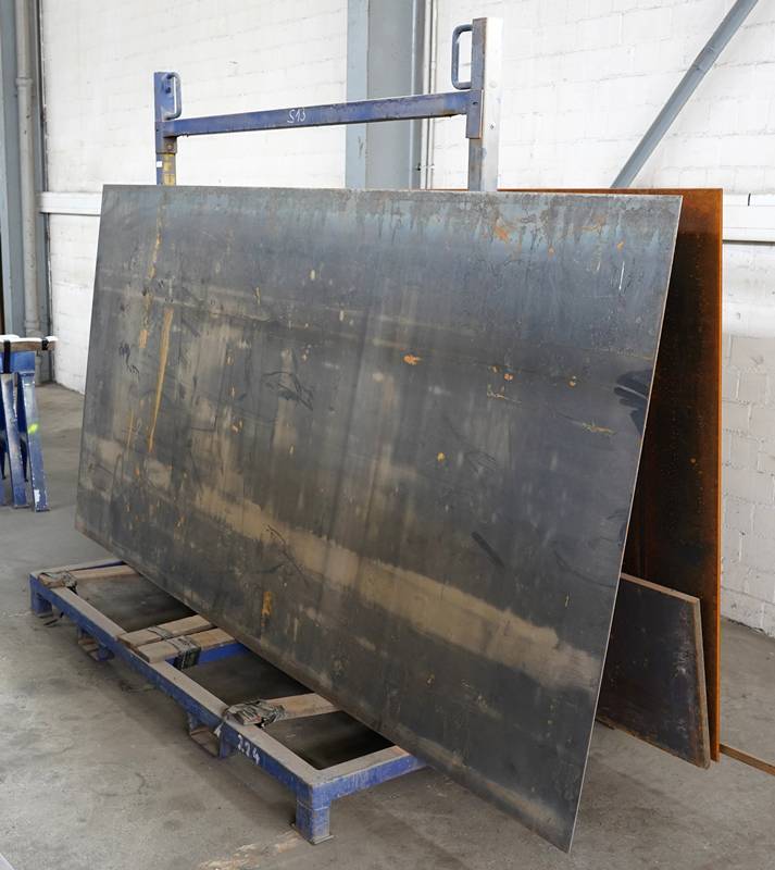 Transportgestell für Plattenware. Mit Kranösen und Kramgehänge. Mit diversen Stahlplatten bestückt.