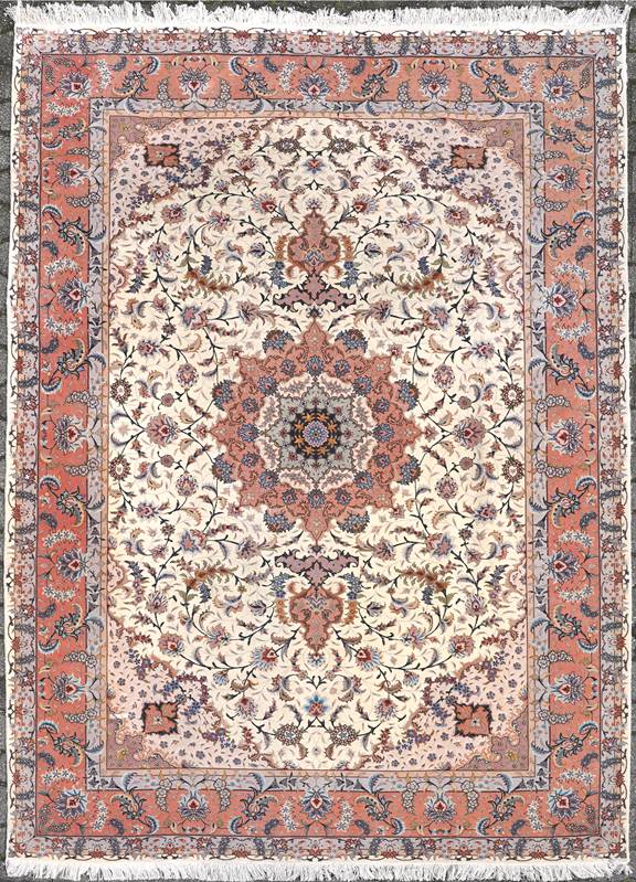 Täbriz Iran, 20. Jh. Seidenteppich. Dreifachbordüre, zentrales Medaillon auf hellgrundigem Innenfeld mit floralem Dekor. Verso mit Etikett. Größe ca. 300 x 200 cm, ca. 7 x 7 Knoten/qcm. Zustand wie abgebildet.