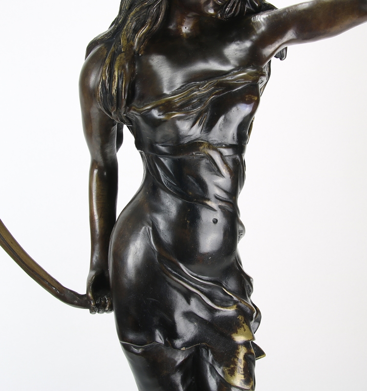 20. Jh. Junge schöne Frau mit einem Band auf Sockel stehend. Vorne bezeichnet. Bronzeguß, dunkel patiniert. Größe ca. 39 x 23 cm, Höhe ca. 87 cm, Gewicht ca. 12 Kilogramm.
