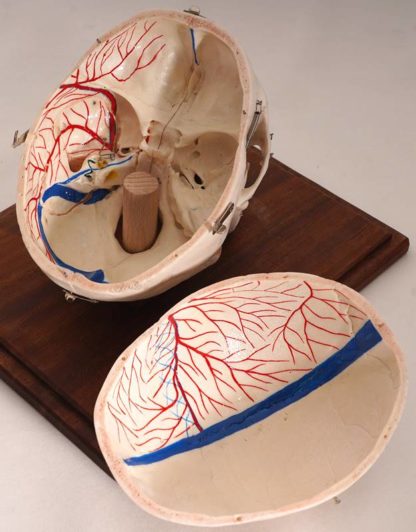Anatomischer Schädel Mit verschiedenen Einblickswinkeln durch Scharniere, auseinandernehmbar, mit Darstellung der Nervenbahnen. Auf Holzplatte und unter Kunststoffhaube ca. 20 x 25,5 cm, Höhe ca. 21 cm.