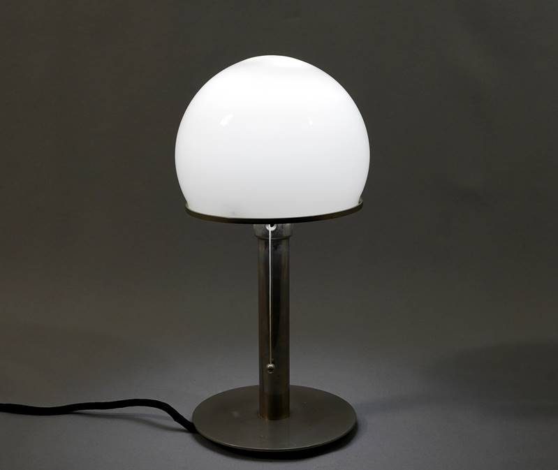 1900 Bremen - 1990 Stuttgart. Tischlampe Modell Wa 24. Entwurf von 1924. Ausführung Tecnolumen. Fuß, Säule, Einfassung aus Metall, vernickelt. Runder Standfuß mit halbkugelförmigem Glasschirm, opalüberfangen. Unter dem Boden mit Herstellerklebeetikette und geprägter Nummer 6685. Höhe ca. 36 cm, Durchmesser ca. 18 cm. Gewicht ca. 2 kg. Gebrauchter Zustand. Funktion ohne Gewähr. Bitte besichtigen sie selbst. Siehe Literatur Moderne Klassiker. Möbel, die Geschichte machen, S. 130f.