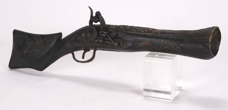 Dekor Donnerbüchse Wohl 19. Jh. Holzgriff mit eingelegtem Draht in ornamentalen Mustern. Reliefierter Metalllauf in Trichterform. Länge ca. 42 cm. Altersbedingter Zustand wie abgebildet, Funktion nicht geprüft.