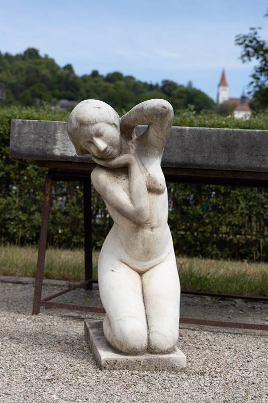 20. Jh. Marmor. Aktdarstellung einer weiblichen, knienden Figur aus Marmor. Ihr linker Arm ist über ihre Schulter erhoben, ihr Kinn schmiegt sich an ihre rechte Hand. Ihr Gesicht zeigt einen sanften Ausdruck. Größe ca. 82 x 35 x 52 cm. Dieses Los befindet sich an einem abweichenden Standort in Bayern und kann nicht besichtigt werden. Versand nicht möglich, nur Abholung.