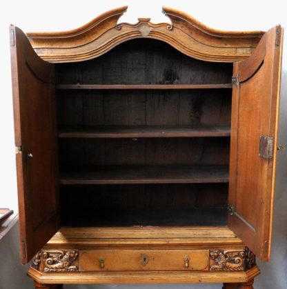 Wohl Danzig um 1750. Eichenkorpus auf kugeligen und gedrückten Stollenbeinen im Verbund. Reich mit geflügelten Fabelwesen geschnitztes Unterteil mit einer Schublade und zweitüriges aufgesetztes Oberteil mit geschnitzten Ranken und Sprenggiebel. Größe ca. 144 x 60 cm, Höhe gesamt ca. 196 cm.