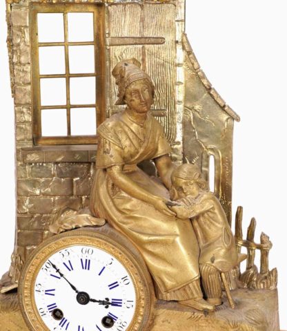 Kaminuhr Frankreich 19. Jh. Metallguss. Goldfarbener Sockel auf vier ausgestellten Füßen, floral reliefiert. Darüber naturalistisch ausgearbeitete Szene mit einer Mutter, ihr Kind zu ihren Füßen, eine Hauswand im Rücken. Sie sitzt auf dem Uhrenzylinder. Emailliertes Ziffernblatt mit blauen, römischen Stundenzahlen und schwarzer, arabischer Minuterie. Rundes Messingplatinenwerk mit Pendel und Schlag auf Glocke. Größe ca. 31 x 11 cm, Höhe ca. 46 cm. Pendel und Glocke fehlen.