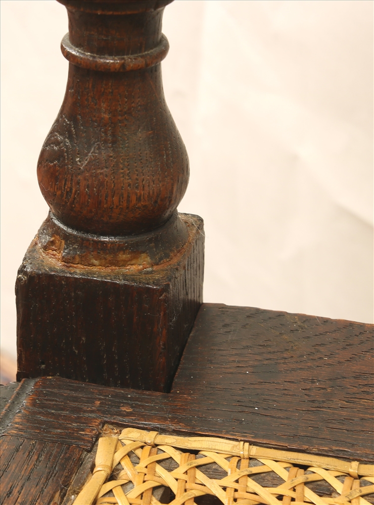 Deutsch um 1900. Eiche, nußbaumfarben lasiert und Korbgeflecht. Schöne Applikationen. Größe ca. 45 x 40 cm, Höhe ca. 95 cm, Sitzhöhe ca. 44 cm. Altersbedingt guter Zustand.