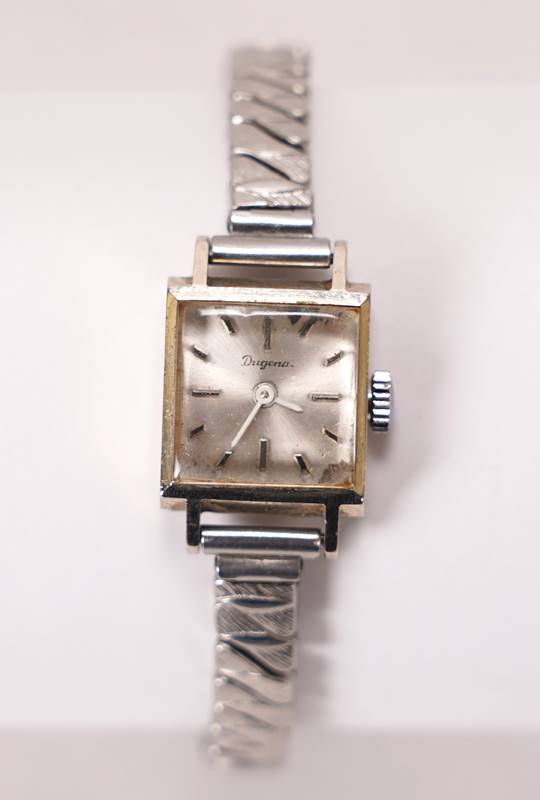 Deutsch 20. Jh. Goldgehäuse 585. Quadratisches, silberfarbenes Ziffernblatt. Unter der Zwölf bezeichnet. Verso bezeichnet und punziert. Kronaufzugswerk. An Flexband. Größe des Ziffernblatt ca. 1,3 x 1,3 cm, Gesamtgewicht ca. 15,7 Gramm. Funktion nicht getestet. Ziffernblatt teils beschädigt, Armband wohl nicht zugehörig.