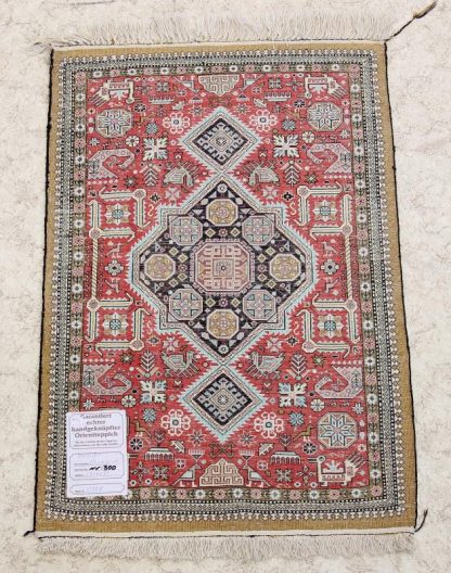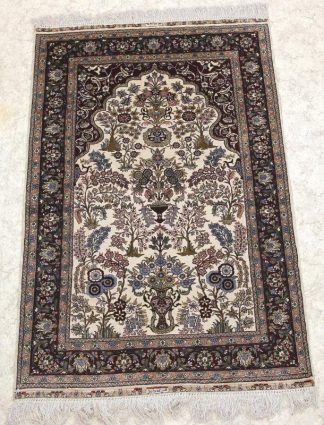 Ghom 20. Jh. Seide/Seide. Größe ca. 84 x 56 cm. Knüpfdichte ca. 800.000 Knoten / qm. Guter Zustand. Ehemaliger Verkaufspreis 2.500.- Euro. Ehemals süddeutsche Privatsammlung.