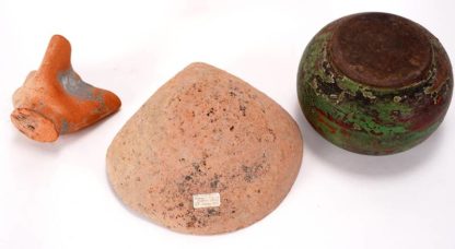 Vorantike Öllampen Wohl Vorantike, ca. 10. - 8. Jh. v. Chr. oder jünger. Eine kanaanitische Öllampe mit altem Sammleretikett, sowie eine wohl abrahamitische Öllampe, jeweils aus Terracotta. Dazu ein hölzernes, ausgehöhltes Gefäß mit runder Öffnung und mit bauchiger Form, farbige Fassung teils noch erhalten. Max. Größe ca. 15 x 15 cm, Höhe ca. 5 cm. Intakter Zustand, wie abgebildet. Versand nur bei Risikoübernahme.