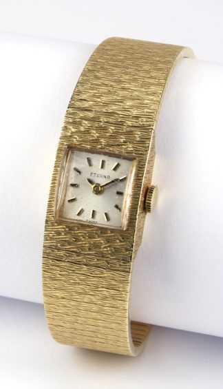 Eterna Schweiz. GG 750 Breites, massives Band mit Flechtstruktur. Quarzwerk mit quadratischem Zifferblatt und 12 Diamanten als Stiftminuterie. Länge ca. 16,5 cm, Gewicht ca. 44 Gramm inklusive zweier Verlängerungsglieder. Rechnung der Fa. Spinnler + Schweizer, Basel aus dem Jahr 2002 über 2.975 SFr. beiliegend. Läuft nicht, Batterien leer.