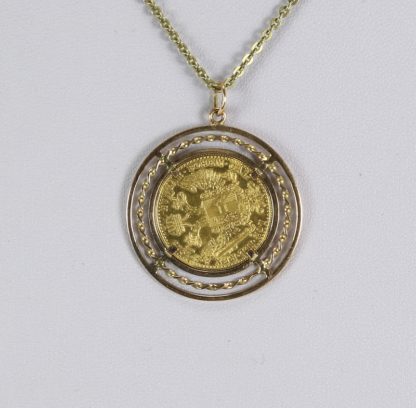 Münzanhänger Ein Dukat Stück GG 900 mit Portrait Kaiser Franz-Joseph, verso Doppeladler und Jahreszahl 1915 in Fassung GG 585 (Punze verschlagen, geprüft) und passender Kette GG 585. Gesamtgewicht ca. 11,6 Gramm.
