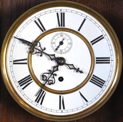 19. Jh.. Hochrechteckiger, dunkel gebeizter Korpus mit dreiseitiger Verglasung. Runder Emailleziffernring mit römischen Stundenzahlen in Messingeinfassung, Sekunde unter der Zwölf. Messingplatinenwerk mit Pendel und einem Gewicht. Auf dem Werk Seriennummer 91773. Größe ca. 38 x 16 cm, Höhe ca. 120 cm. Läuft an, Kurbel anbei. Zustand wie abgebildet. Kein Versand möglich nur Abholung