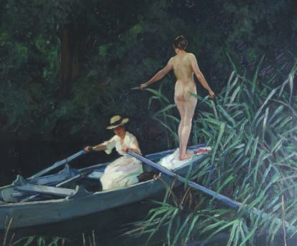 1886 Schoenau - 1948 Karlsruhe. Das blaue Boot mit Rückenakt und bekleideter Freundin. Öl auf Leinwand. Unten rechts signiert, verso originales Etikett mit Titel sowie Farbpalette. Größe ca. 80 x 99 cm, Rahmen ca. 92 x 112 cm. Teils etwas Farbverlust.