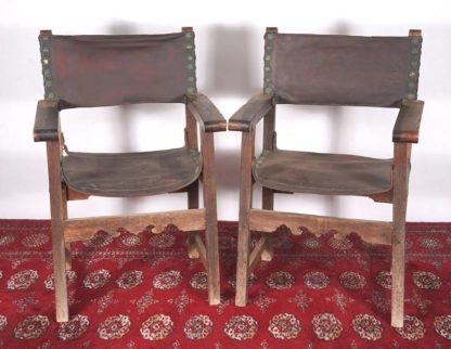Paar Stühle Spanien, Neogotischer Stil. Hartholz und Leder. Größe ca. 64 x 53 cm, Höhe ca. 102 cm, Sitzhöhe ca. 53 cm. Wurm wohl nicht mehr aktiv. Altersbedingter Zustand.