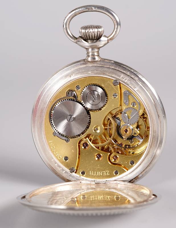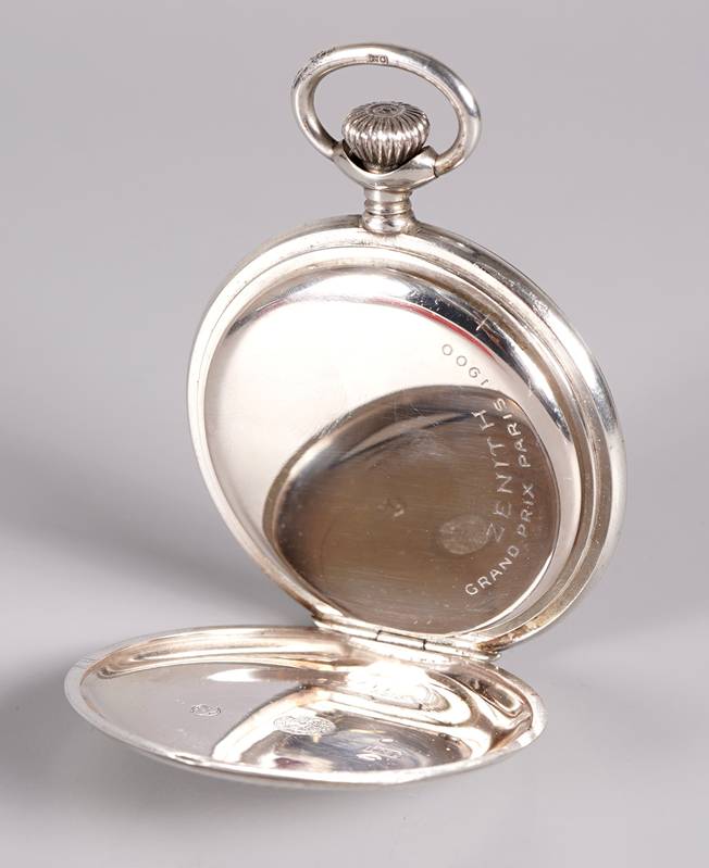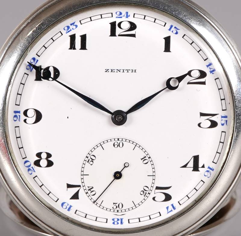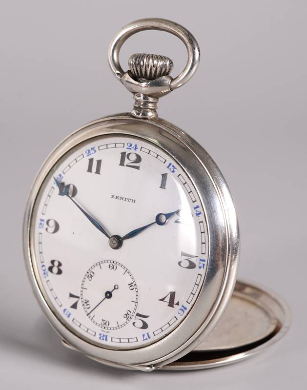 Zenith Taschenuhr Schweiz. Silber 800. Emailliertes Ziffernblatt mit arabischen Stundenzahlen bis 24 und dezentraler Sekunde bei der Sechs. Kronaufzugswerk. Äußerer Deckel mit Herstellerpunze, Feingehalt und Auerhahn, innerer Deckel mit Feingehalt und Auerhahn. Durchmesser ca. 5 cm, Gewicht ca. 80 Gramm. Läuft an.