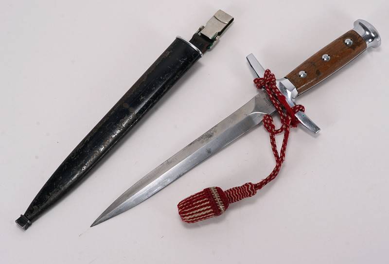Dolch Schweiz Anfang 20. Jh. Holz eingelegte Metallgriffschale mit Parierstange und Portepee. Stahlklinge Elsener Schwyz, verso nummeriert 48701. Geschwärzte Stahlscheide. Klingenlänge ca. 21 cm, Gesamtlänge ca. 34 cm. Zustand wie abgebildet.