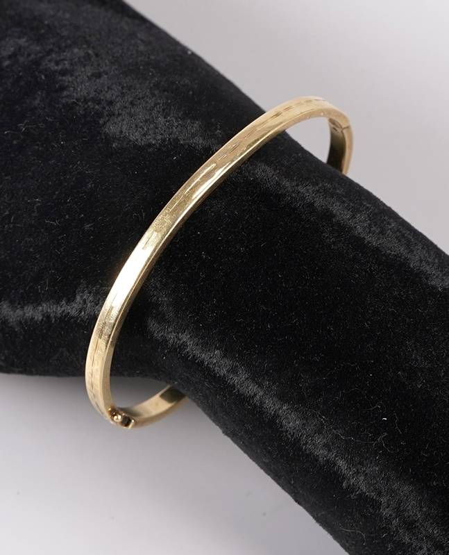 Gold 585. Rechteckiger Reif mit ziselierter Oberfläche. Auf der Schließe punziert. Umfang ca. 19,5 cm, Gewicht (gefüllt) ca. 10,4 Gramm. Altersbedingter Zustand wie abgebildet.