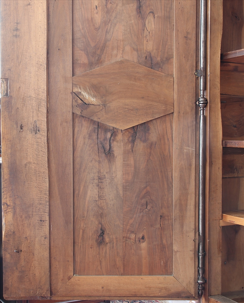 18. Jh. Nußbaum. Zweitürig mit einer unteren Schublade und überkragendem Steckgesims. Vorne gedrehte Füße und seitliche Halbsäulen. Originale Beschläge und durchgehende Eisenbänder, Schloß neuer. Größe ca. 174 x 69 cm, Höhe ca. 232 cm. Altersbedingter Zustand mit Wurm (aktiv) wie abgebildet. Komplett zerlegbar.