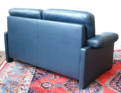 Schweiz 1980-er Jahre. Zweisitzer mit blauem Leder. Abnehmbare Rückenlehnen und Sitzpolster. Größe ca. 165 x 92 cm, Höhe ca. 90 cm. Gebrauchsspuren.