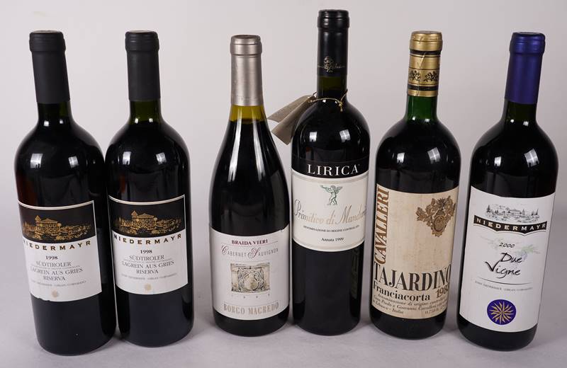 Unter anderem 3 x Niedermayr Südtiroler Lagrein aus Gries Riserva 1998, 2 x Cavalleri Tajardino Franciacorta 1983 und 1 x Coltifredi Predicato di Cardisco 1988. Insgesamt 12 Flaschen 0,75l. Zustand wie abgebildet, bitte selbst besichtigen. Aus einer großen, rheinländischen Privatsammlung.