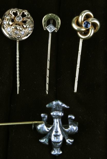 Ab ca. 1900. Von links nach rechts. Mit blauem Farbstein, GG 750 (Kopf), 585 (Nadel) jeweils nicht punziert, geprüft ca. 1 Gramm. Art Deco Nadel GG/WG 585 (nicht punziert, geprüft) mit Altschliffbrillant, ca. 0,3 Carat, weiß, si, Gewicht kpl. ca. 1,3 Gramm. Münznadel GG 585 (nur Kopf gestempelt FIX), Gewicht kpl. ca. 1,6 Gramm. Art Deco Nadel mit Altschliffdiamanten GG 750 (nur Kopf nicht punziert, geprüft), Gewicht kpl. ca. 1,1 Gramm. Nadel mit Diamanten GG 585 (Nadel) bzw. 750 (Kopf) jeweils nicht punziert, geprüft, Gewicht ca. 2,8 Gramm. Zwei Nadeln Hufeisen (Diamant) bzw. Schleifenform (blauer Farbstein) GG 585, Gewicht zusammen ca. 3 Gramm und zwei unedle Objekte unten.
