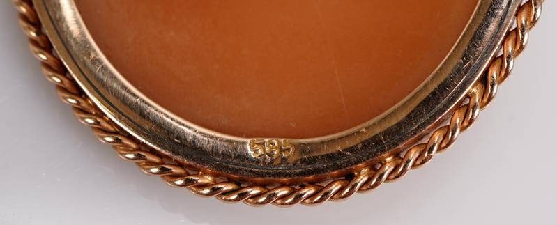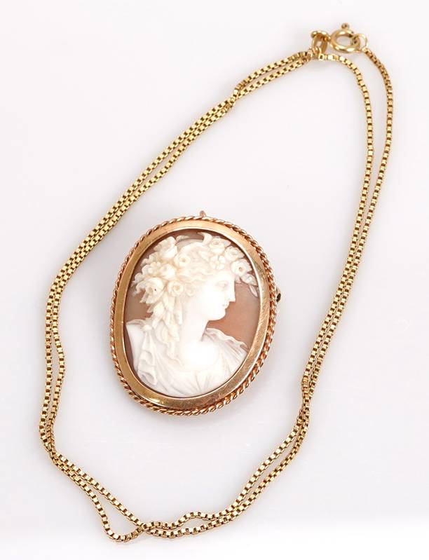 Deutsch 20. Jh. Gelbgold 585 punziert. Antikisierendes Halbportrait einer jungen Flora. Größe Fassung ca. 3,5 x 3 cm, Gewicht ca. 9,9 Gramm an passender Kette, Gelbgold 750, Länge ca. 50 cm, Gewicht ca. 5,2 Gramm. Die Brosche lässt sich auch als Anhänger tragen. Schöner Zustand wie abgebildet.