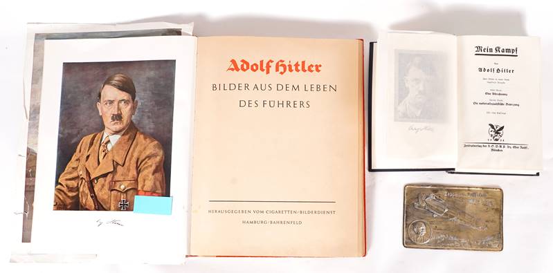 Zwei Bücher. Mein Kampf. Zwei Bände, 123. - 124. Auflage, Eher Verlag München 1934. Mit Widmung im Vorsatz. Adolf Hitler - Bilder aus dem Leben des Führers. Hamburg/Bahrenfeld 1936. Dazu eine Metallpostkarte mit Papiereinlage und herausnehmbarer Stütze Zeppelins Luftschiff im vollen Fluge. Frankiert und gestempelt Deutsche Luftpost 30.7.35.
