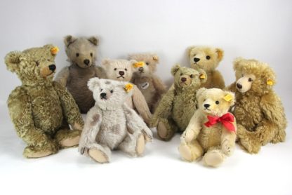 Konvolut Steiff Deutsch 20. Jh. Wolle und Baumwolle. Neun verschiedene Bären. Verschiedene Alter. Alle mit Knopf im Ohr und gelber Fahne. Teils mit Schild an der Brust. Maximale Größe ca. 37 cm. Bespielt.