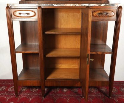 Frankreich 1920. Verschiedene Hölzer. Unterteil auf vier kannelierten Beinen. Zentrale Tür, flankiert von Etageren mit oben je einer Schublade. Abdeckung durch Marmorplatte. Rückseitiger Abschluss mit durchgehendem, geschliffenen Spiegelelement. Größe ca. 125 x 42 cm, Höhe ca. 117 cm, Gesamthöhe ca. 155 cm. Marmorplatte teils best.