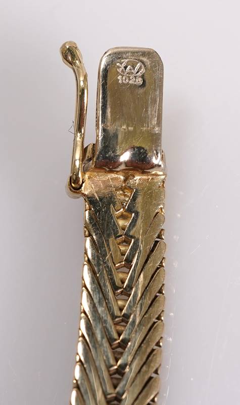 Deutsch 1970/80-er Jahre. Gelbgold 585 punziert. Flache Gewebekette, nach unten zweifach verschlungen gearbeitet. Kastenschloss mit Sicherheitsacht. Länge ca. 42 cm, Gewicht ca. 47,6 Gramm. In der nächsten Position das passende Armband. Schöner Zustand wie abgebildet.