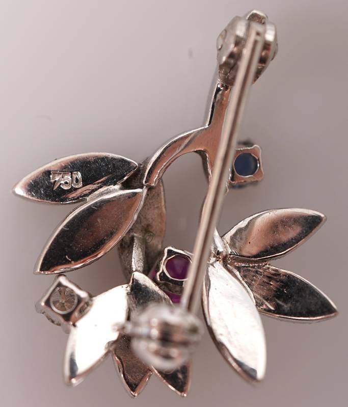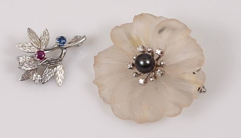 Deutsch 1970/80-er Jahre. Jeweils punziert mit 750. Blattbrosche mit je einem Brillanten, Saphir und Rubin, Größe ca. 2,4 x 2 cm, Gewicht ca. 3,3 Gramm und eine Blütenbrosche aus weißem Stein besetzt mit einer grauen Perle (ca. 5,5 mm) und fünf Diamanten, Durchmesser ca. 3,3 cm, Gewicht ca. 10,7 Gramm. Zustand wie abgebildet, teils der Halbedelstein an den Rändern etwas beschädigt.