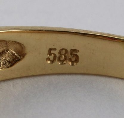 Deutsch 1980-er Jahre. GG 585 punziert. Glatte, sich verbreiternde Schiene mit drei facettierten Rubinen in Krappenfassung, entouriert von acht Diamanten von zusammen ca. 0,08 Carat. Ringgröße ca. 58 bzw. 18,5, Gewicht ca. 5,3 Gramm.