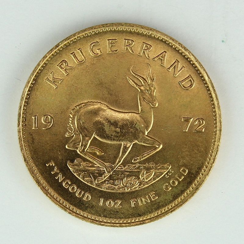 Krügerrand Südafrika 1972. Durchmesser ca. 32,6 mm, Gewicht ca. 33,9 Gramm, Feingehalt 919,6/1000.