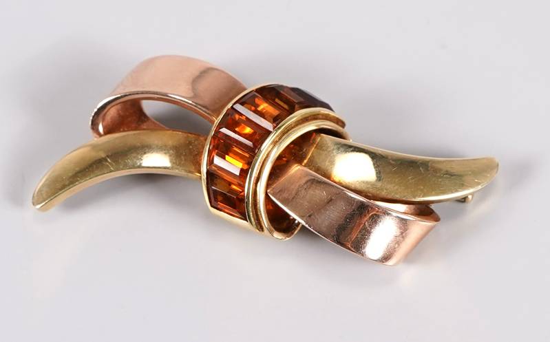 Schleifenbrosche Gold 585. Schleife aus Rot-und Geldbgold, zentral mit sechs Steinen besetzt. Verso punziert. Größe ca. 6,5 x 2 cm, Gewicht ca. 11,7 Gramm.