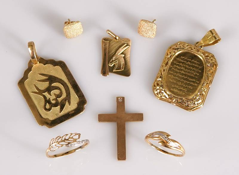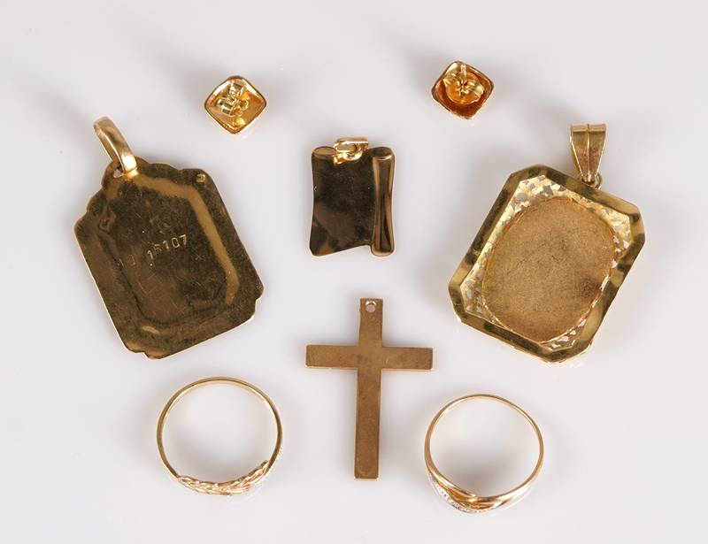 Konvolut Goldschmuck Verschiedene Hersteller. 3 x Anhänger Gelbgold 333. Nicht oder ungedeutet punziert. Gesamtgewicht ca. 10,8 Gramm. Anhängekreuz, 2 x Ring und Paar Ohrstecker. Nicht oder ungedeutet punziert. Gelbgold 585 bzw. 1 x 750. Gesamtgewicht ca. 8,4 Gramm. Zustand wie abgebildet. Bitte selbst besichtigen.