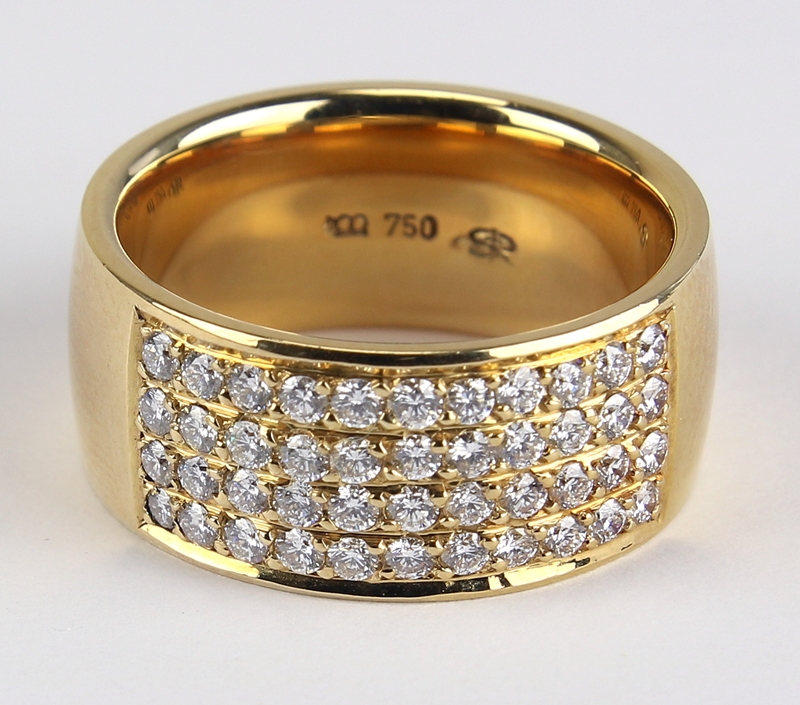 Deutsch Jahrtausendwende. GG 750, punziert und mit Meistermarke und Caratanzahl gestempelt. Glatte breite Ringschiene mit 44 in vier Reihen paveé gefassten Brillanten von zusammen 1 Carat, lupenrein, TW - River laut Expertise von Robert Stiegele, Freiburg aus dem Jahr 2001. Ringgröße ca. 19 bzw. 60, Gewicht ca. 18,5 Gramm. Expertise und Rechnung über 4.000.- DM beiliegend.
