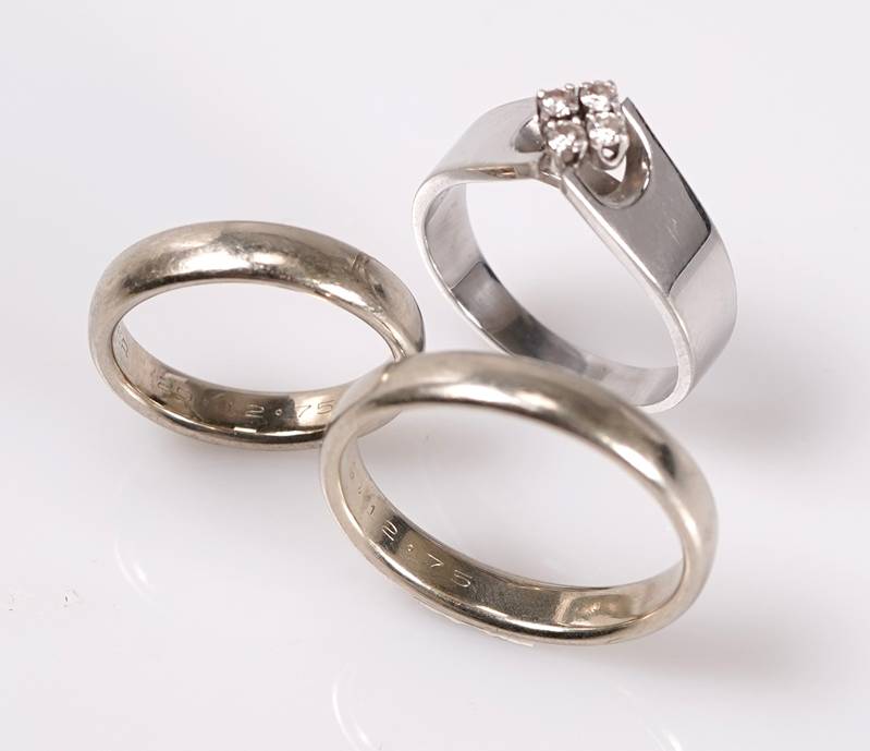 Deutsch um 1970. Weißgoldring 750 ,mit 4 x Zirkonia. Ringgröße ca. 56, Gewicht ca. 6,2 Gramm. Paar Eheringe Gold 750, ca. 52 bzw. 64, Gewicht zusammen ca. 10,6 Gramm. Zustand wie abgebildet.