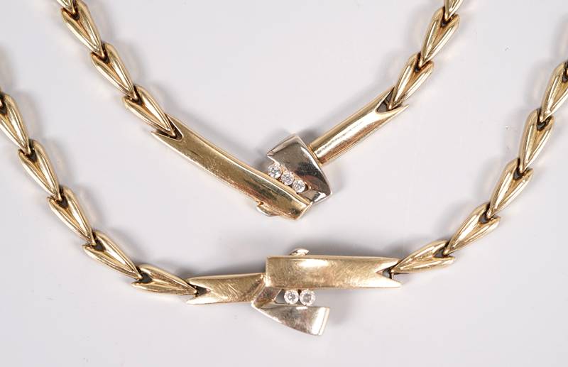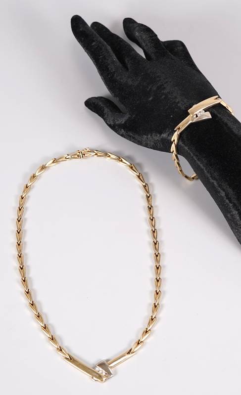 Schmuckset Modernes Collier mit passendem Armband. Je mit farblosen Steinen besetzt. Je mit Kastenschloss mit Sicherungsacht. Je auf dem Kastenschloss punziert 585. wohl 56 legiert (geprüft). Länge des Colliers ca. 47 cm, Länge des Armbands ca. 22 cm. Gesamtgewicht ca. 38,5 Gramm.
